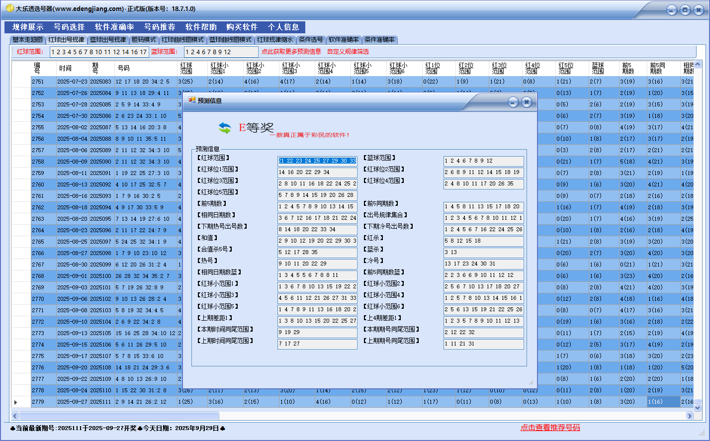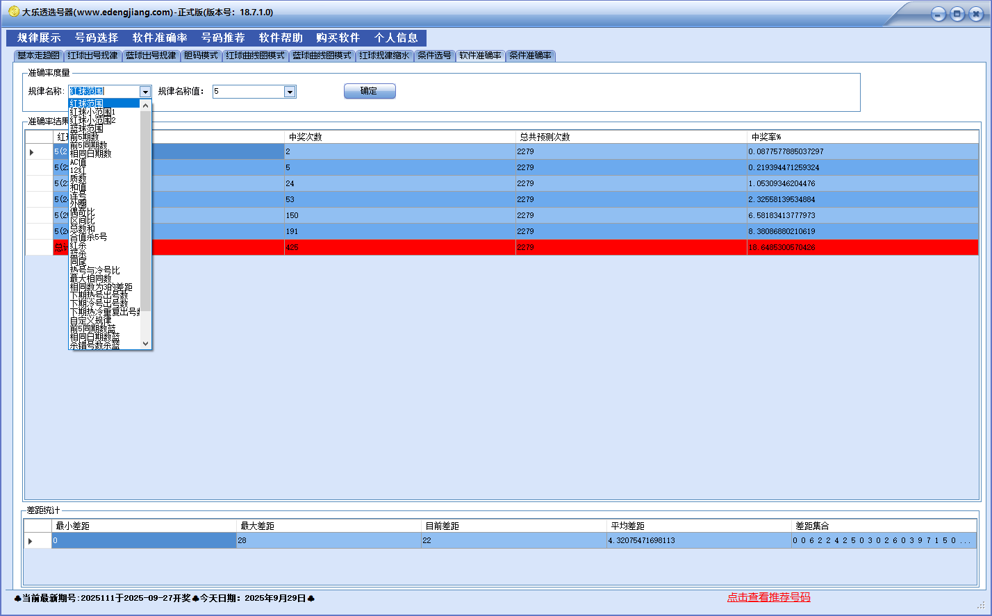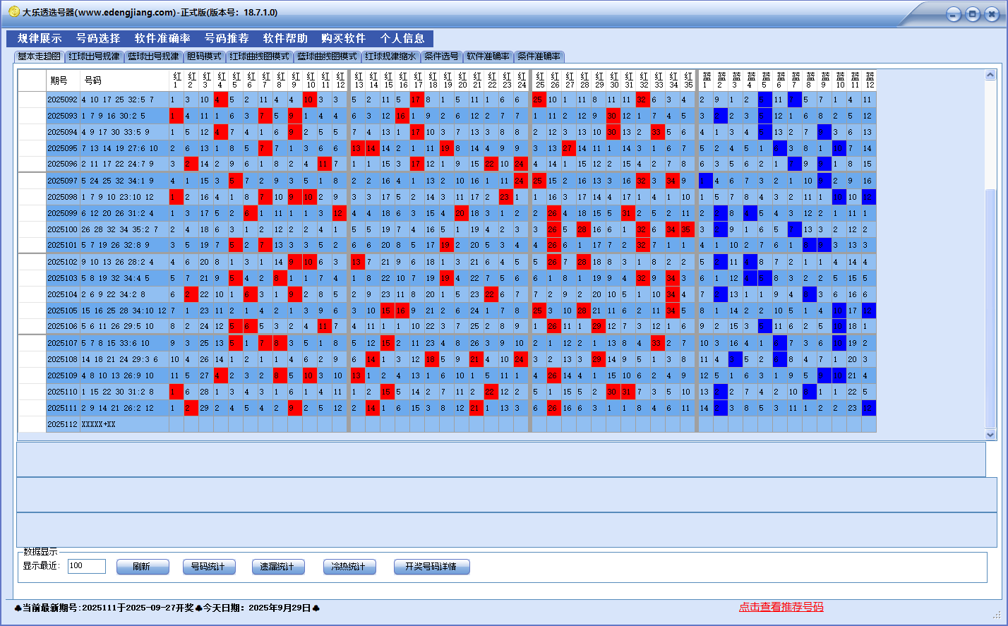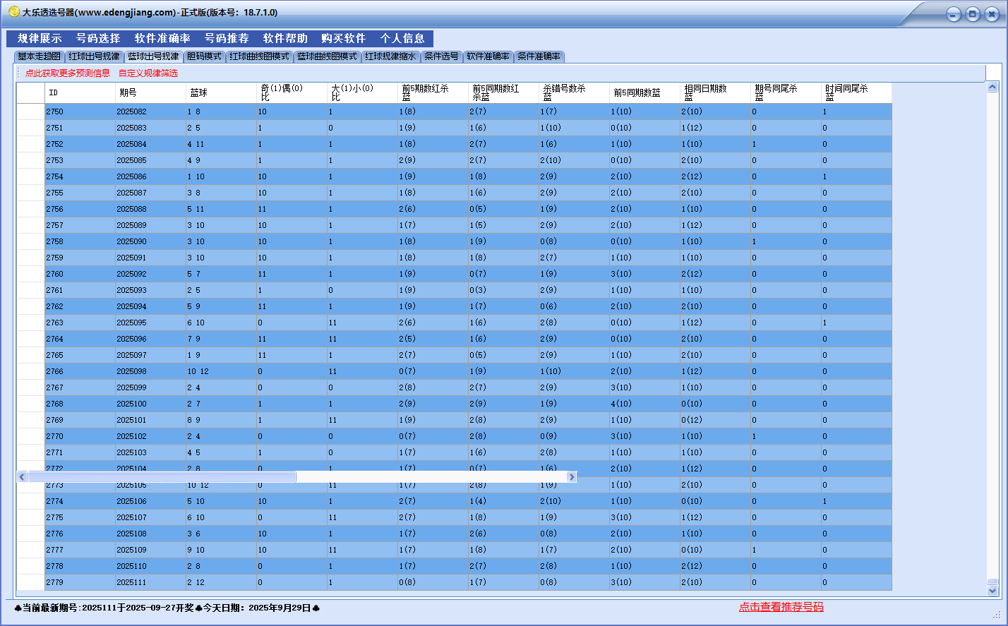 蓝球规律:奇偶比、大小比、前5期数红杀蓝、前5同期数红杀蓝、杀错号数杀蓝、杀错号数杀蓝集合、前5同期数蓝、相同日期数蓝、期号同尾杀蓝和时间同尾杀蓝。
