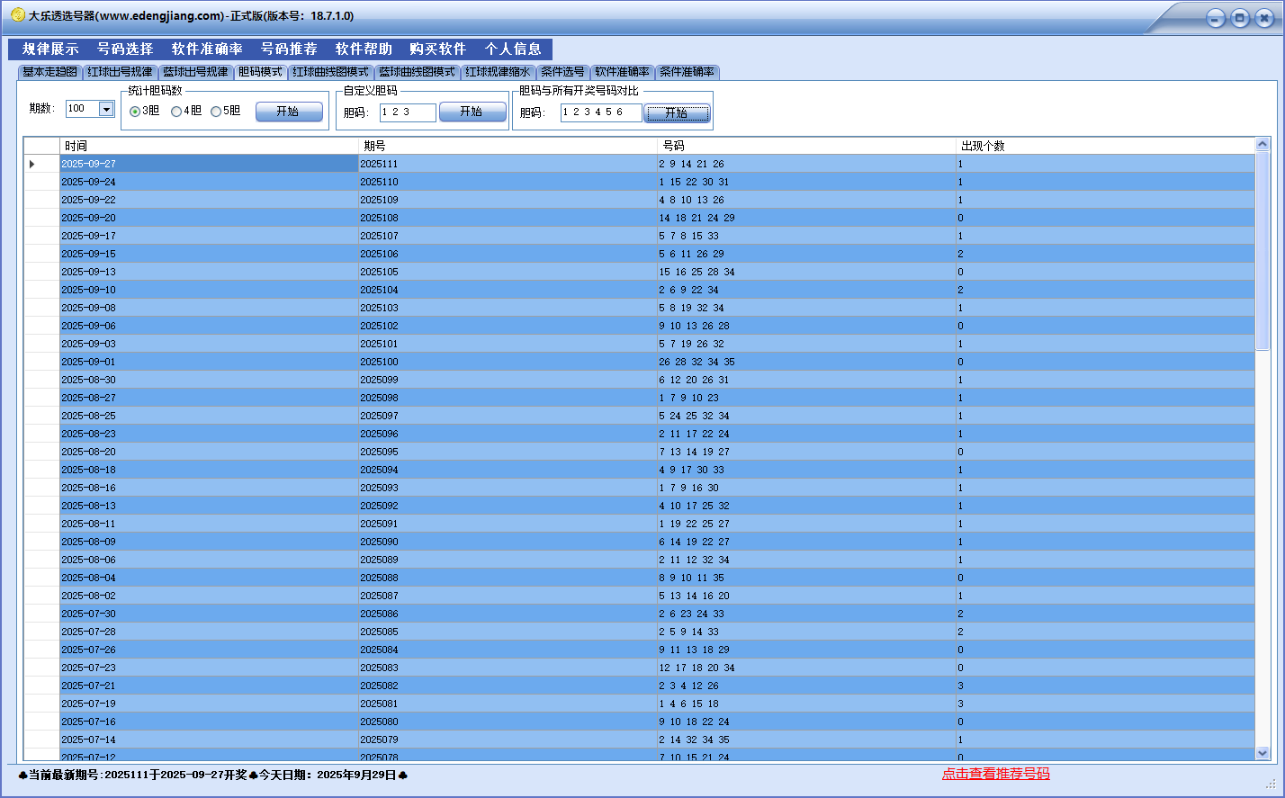 第四、胆码模式。该功能提供了大乐透历史开奖号码当中,任意3号(4号,5号)一起出现的次数及期号以及彩民任意输入X号一起出现的次数及期号。