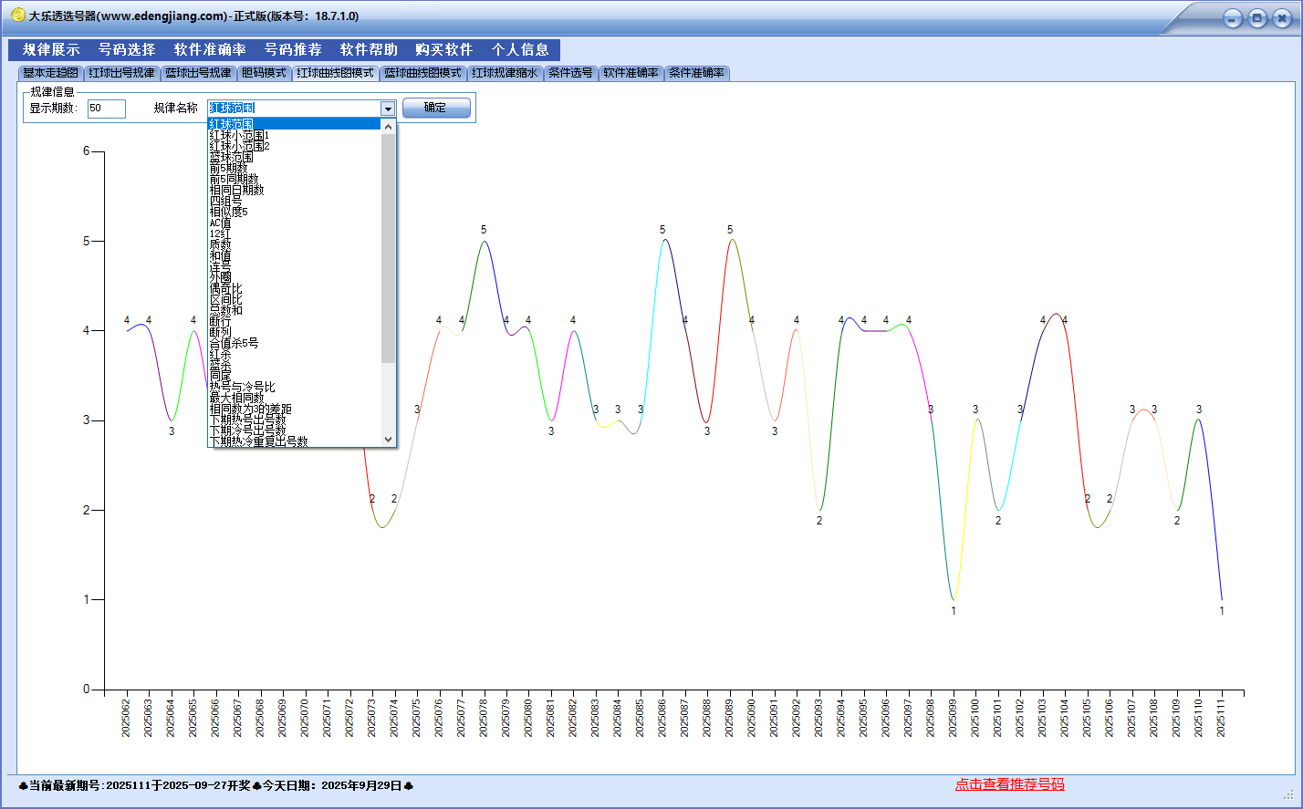 第五、红球曲线图模式。该图将红球的大多数出号规律以图形的方式展示给用户。