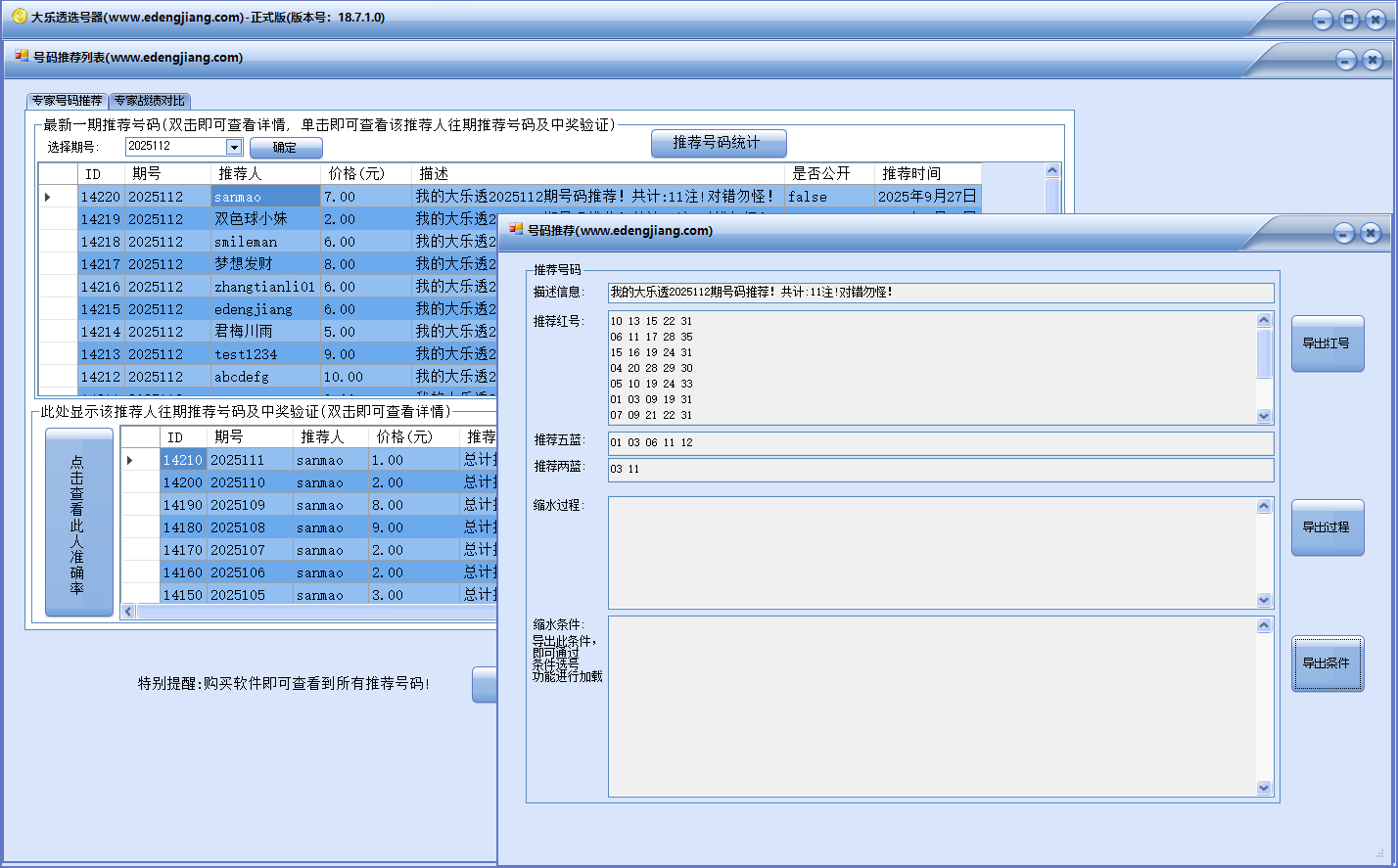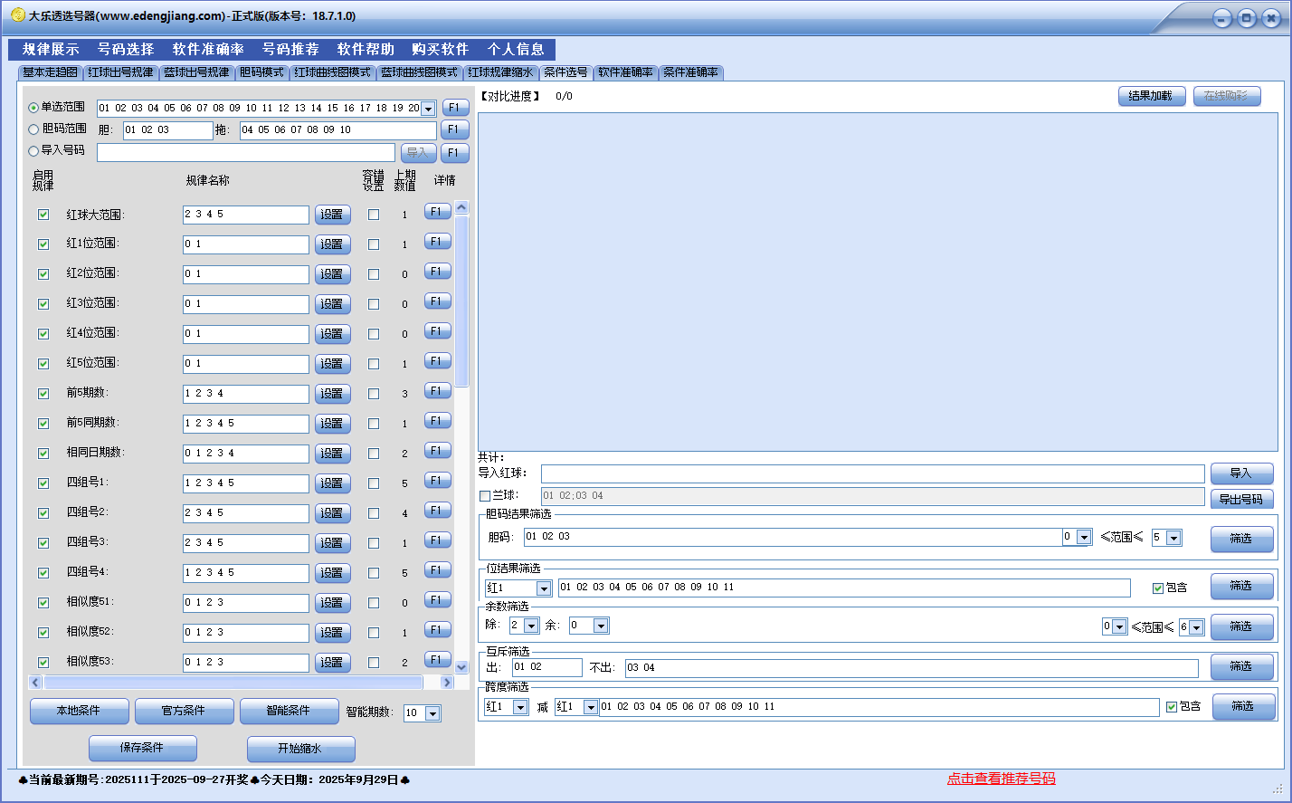 条件选号所用条件可以自由导出、导入。可以对任意某列规律进行排序。