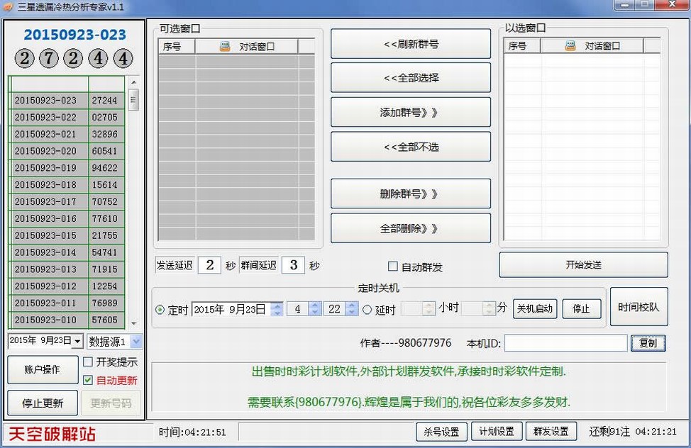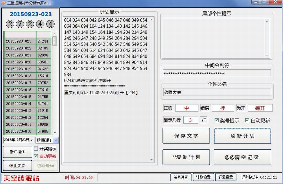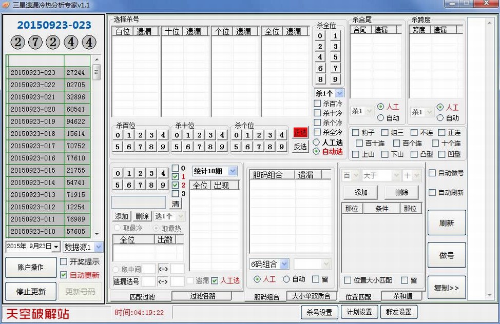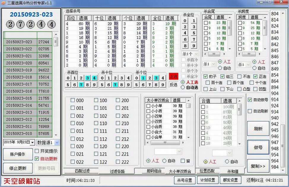 软件利用遗漏统计进行合理的科学组号,条件可以多个条件选取,适合自己分析做计划,可手工期期调,也可设成自动智能过滤,计划有记录功能,可实现全自动人工大底,同时支持群发功能,省时省力