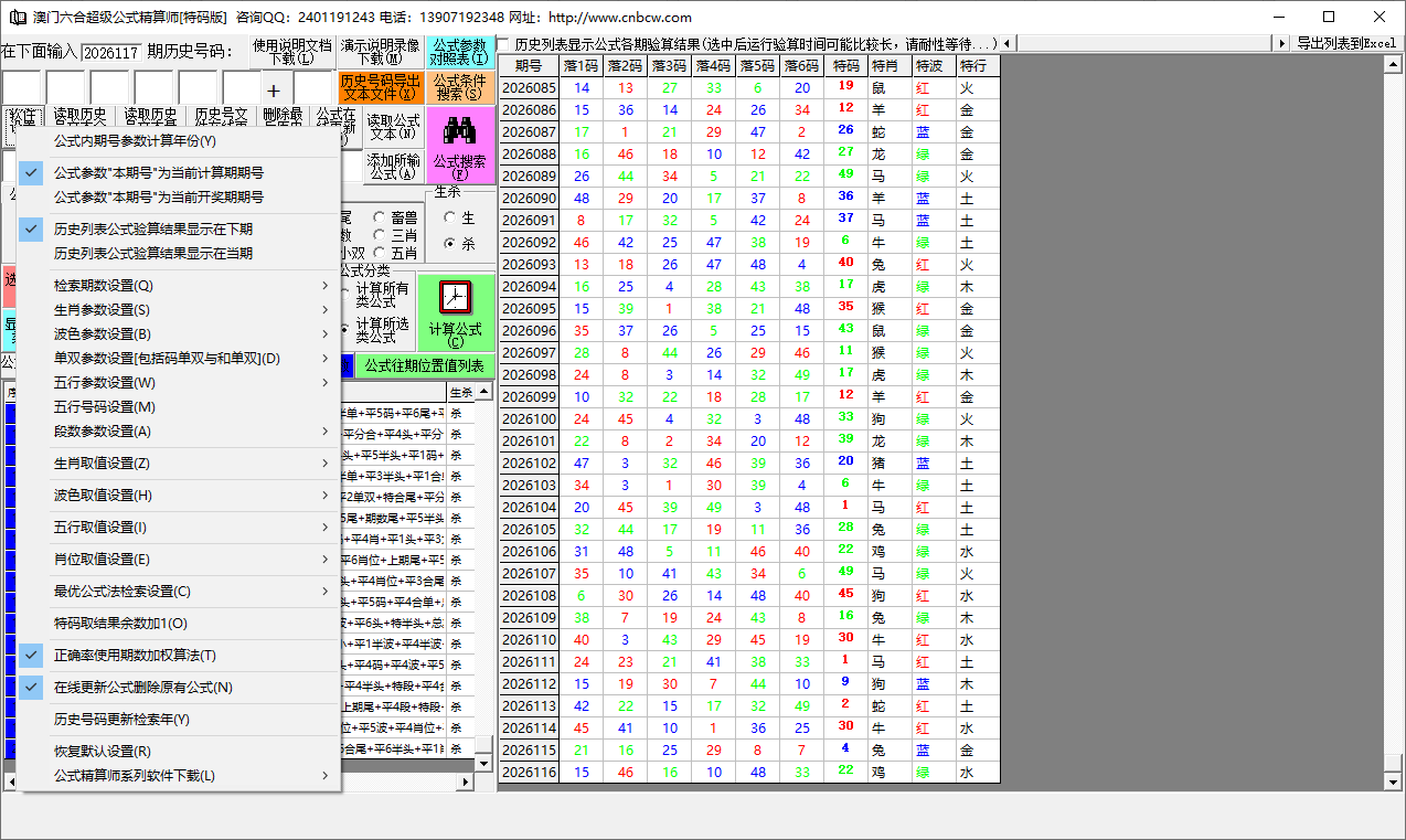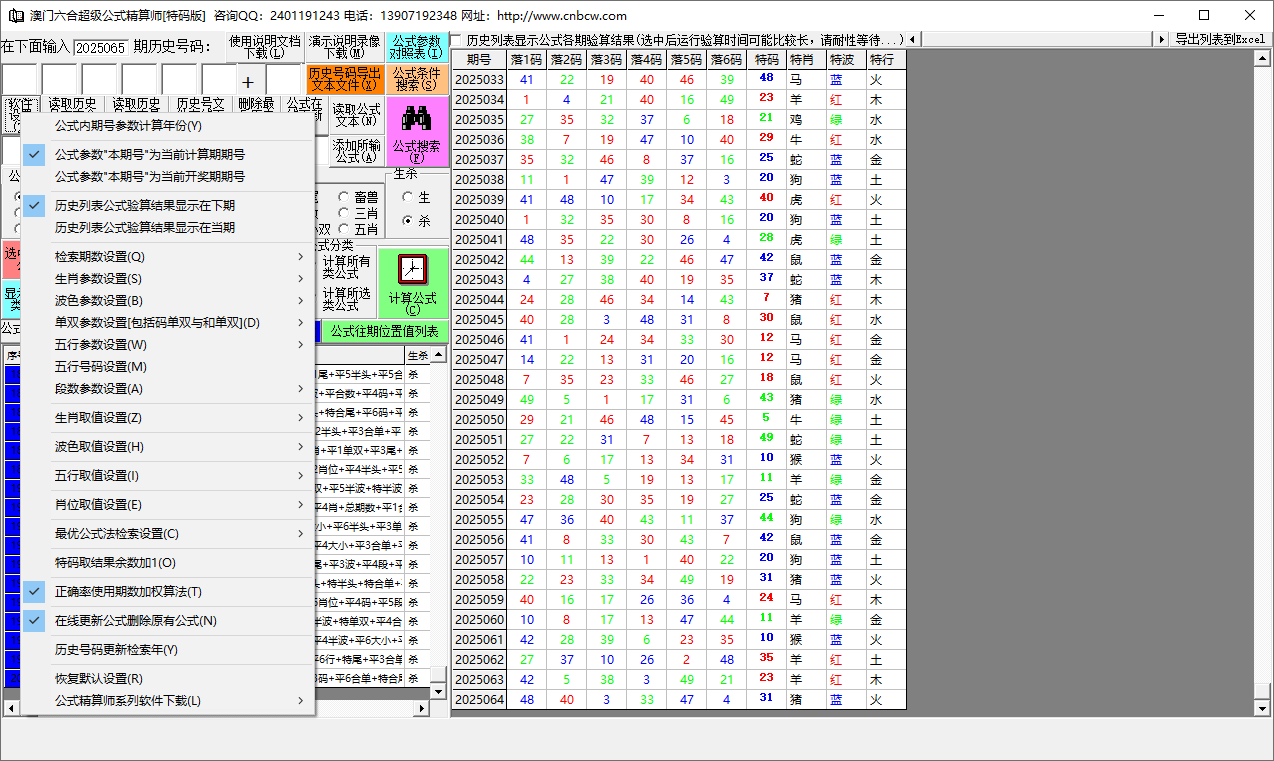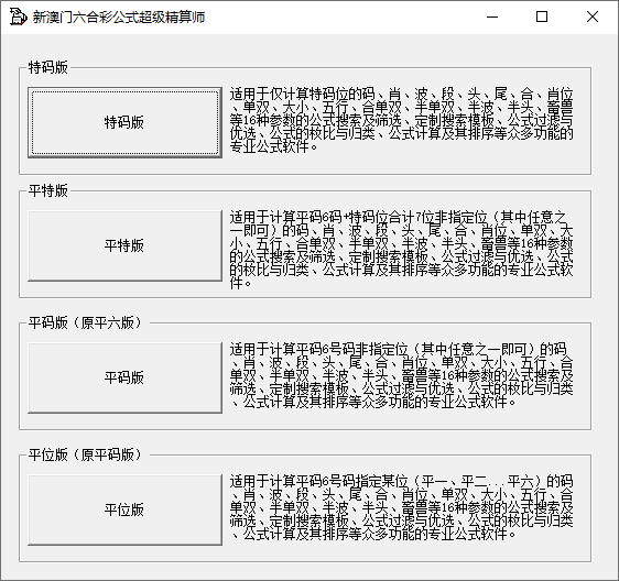 包括特码公式精算师、平特公式精算师、平码公式精算师和平位公式精算师4种软件,可以计算码、肖、波、头、尾、门(段)、(五)行、单双、大小等16种参数