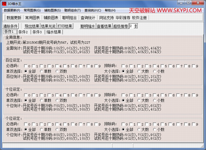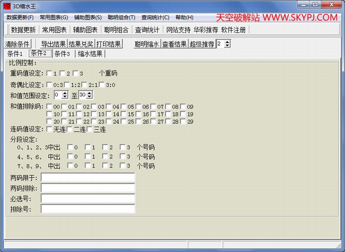 (03)、单击“超强缩水”,进入条件筛选号码,用户输入筛选条件,通过这个运算,大大减少选号数目。