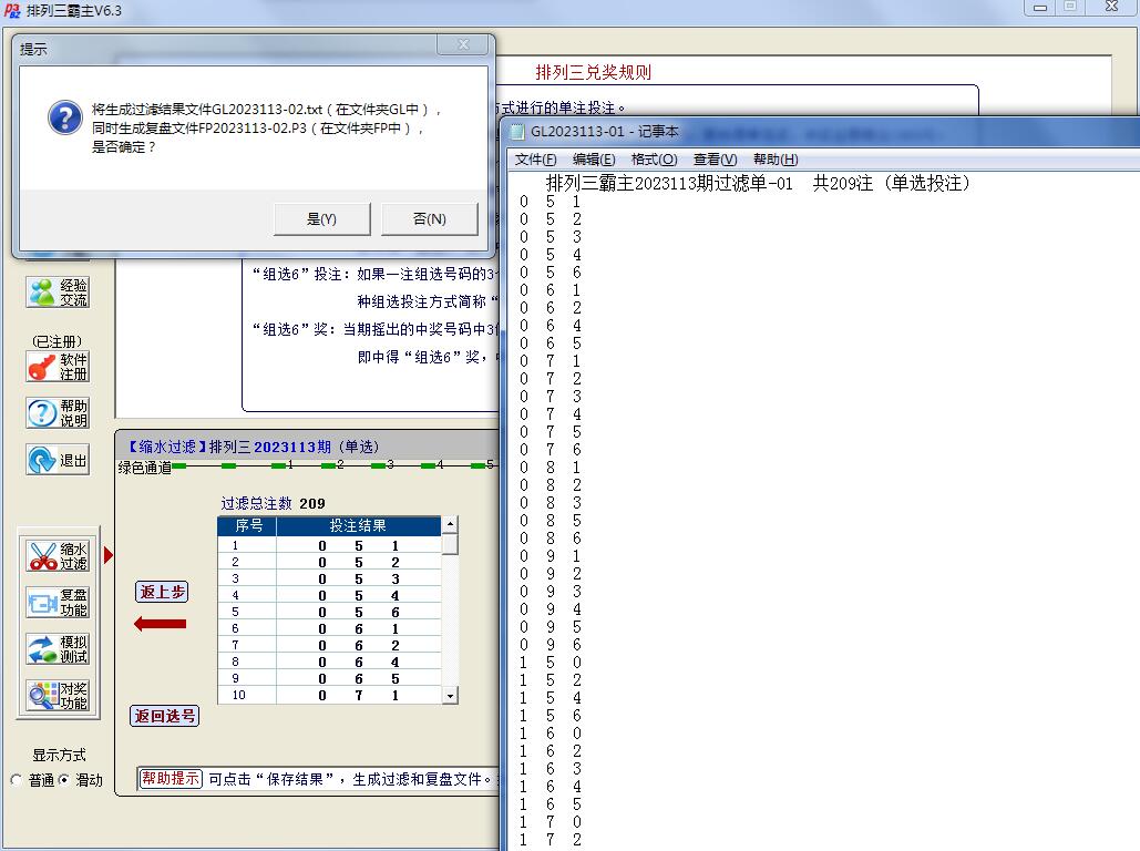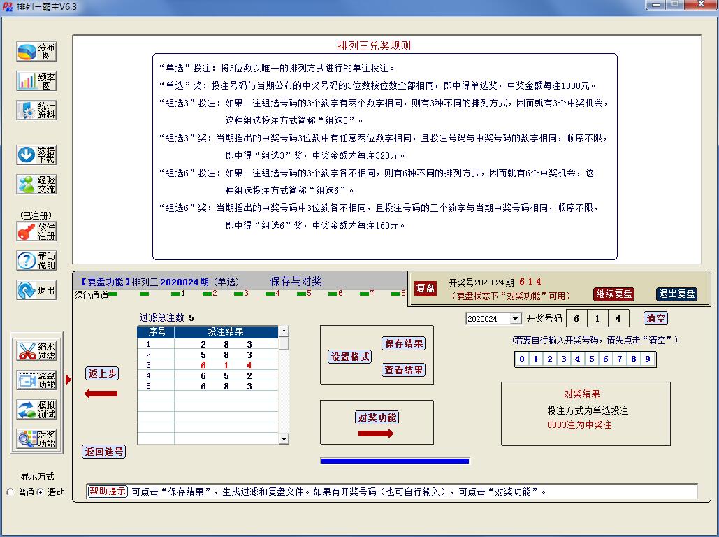 象上述根据规律统计图,挑出中奖率高的注的稳定、有效的过滤方法,《排列三霸主》共有十六种,通过这些方法共同筛选出的注,自然就是中奖率最高的投注。