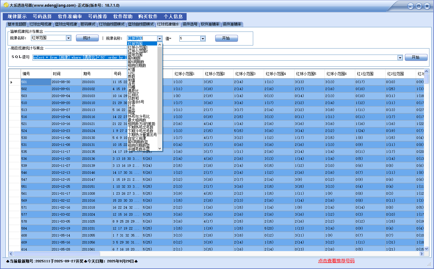 条件选号所用条件可以自由导出、导入。可以对任意某列规律进行排序。